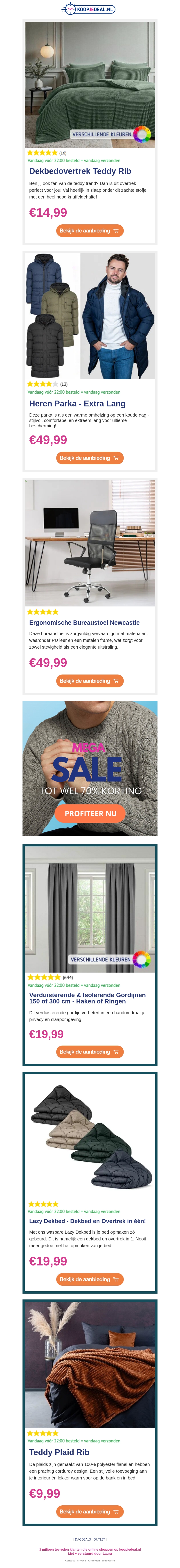 Deze nieuwsbrief biedt een scala aan kortingen op hoogwaardige producten zoals dekbedovertrekken, parka's, en gordijnen. Profiteer nu van deze geweldige aanbiedingen voordat ze weg zijn. Met kortingen tot 70%, is er voor ieder wat wils. Haal het beste in huis tegen gereduceerde prijzen.