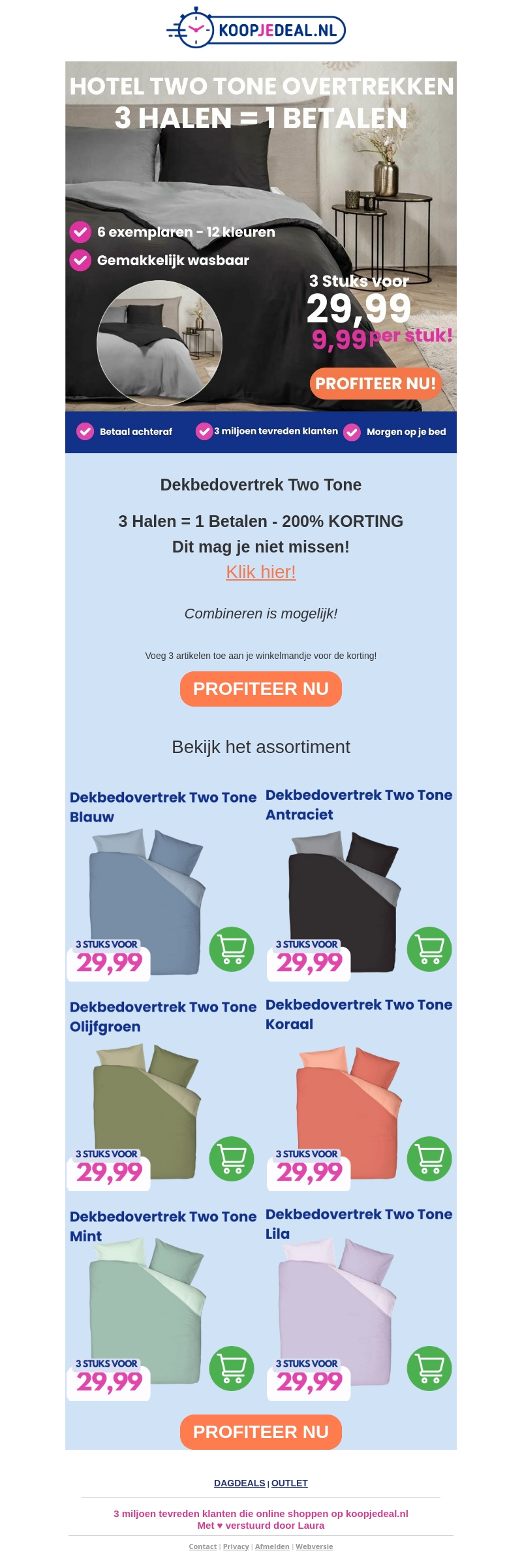 Mis de ultieme kans niet bij Koopjedeal.nl met hun exclusieve aanbieding: 3 halen = 1 betalen op Two Tone dekbedovertrekken. Beschikbaar in 12 stijlvolle kleuren, eenvoudig te combineren en machinewasbaar. Voeg drie artikelen toe aan je winkelmandje en betaal slechts voor één. Met meer dan 3 miljoen tevreden klanten biedt Koopjedeal.nl kwaliteit en gemak. Maak je keuze uit verschillende elegante kleuren en geef je slaapkamer een stijlvolle upgrade.