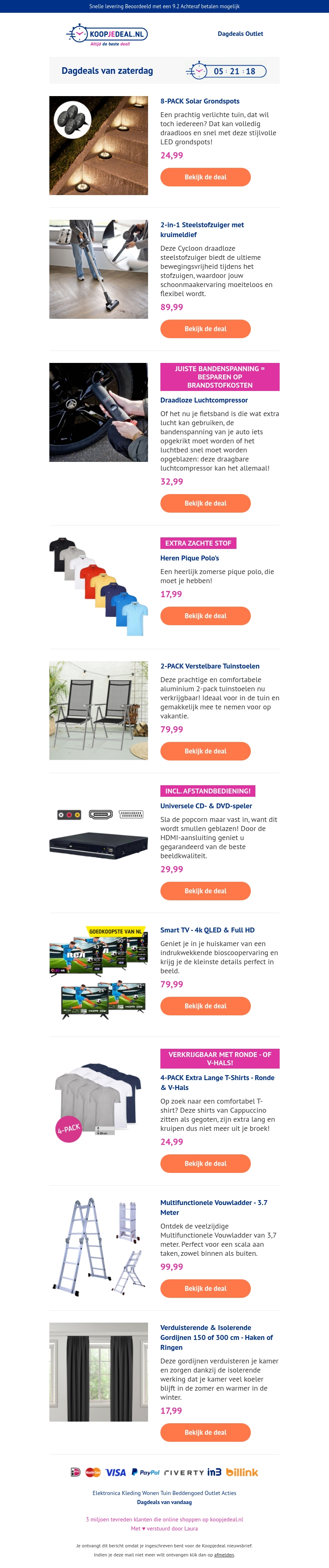 Ontdek de nieuwste dagdeals van zaterdag bij Koopjedeal.nl! Bespaar op een 8-pack solar grondspots, 2-in-1 steelstofzuiger, draadloze luchtcompressor, Heren Pique Polo's en meer. Tal van geweldige aanbiedingen voor elk huishouden.