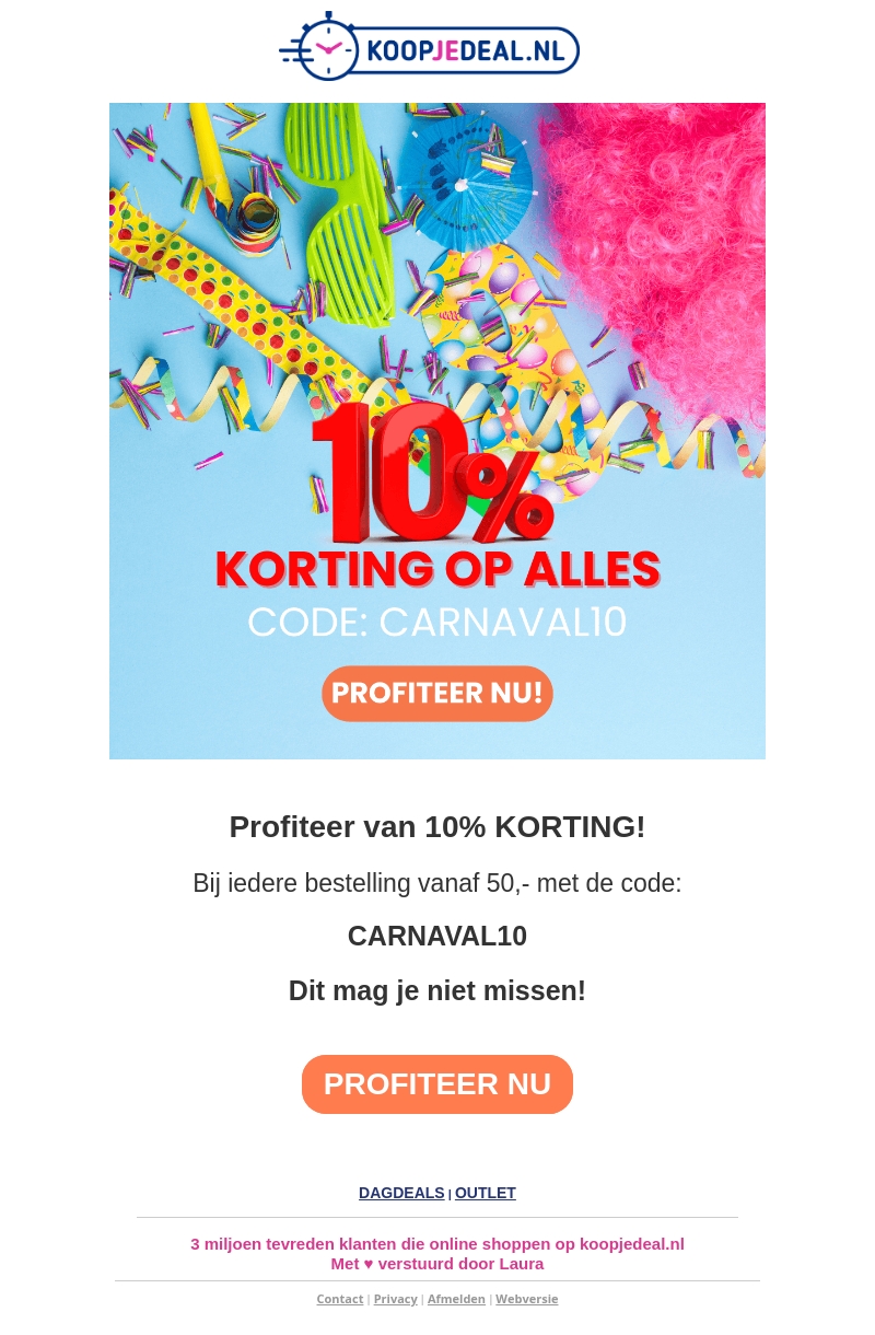 Profiteer van 10% korting op je aankoop bij Koopjedeal. Geldig voor bestellingen vanaf €50. Gebruik code CARNAVAL10 en sla je slag vandaag nog. Mis deze laatste kans op korting niet.