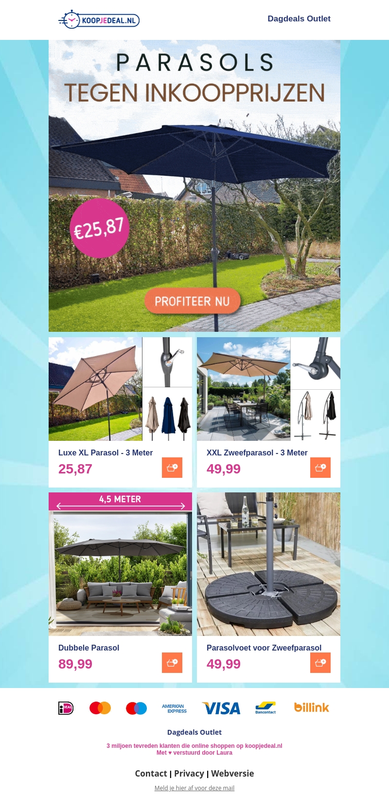 Profiteer van geweldige deals op parasols bij Koopjedeal.nl! Vind luxe parasols in verschillende maten en stijlen tegen lage inkoopprijzen. Mis deze kans niet om jouw tuin of terras klaar te maken voor de zomer. Bekijk ons aanbod nu en bespaar!