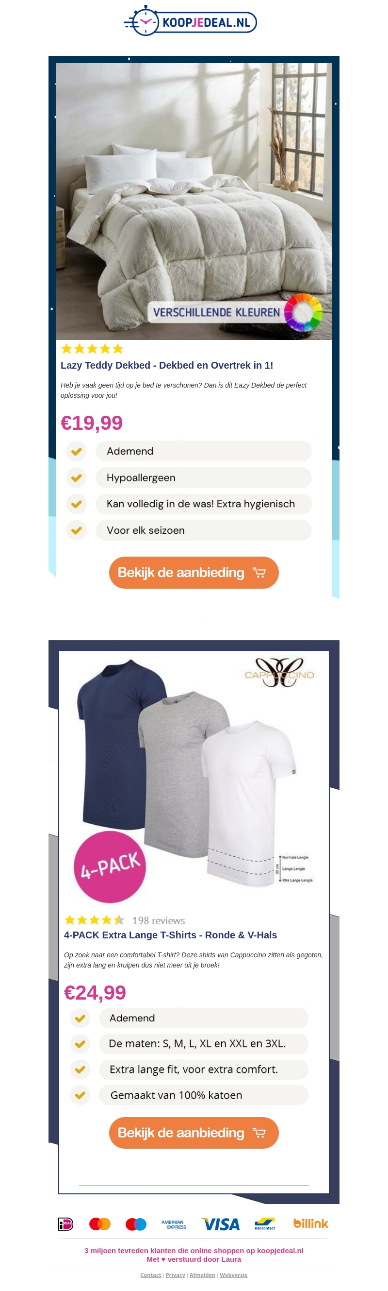 Profiteer van onze nieuwste aanbiedingen zoals het Lazy Teddy Dekbed, een 2-in-1 dekbed en overtrek voor slechts €19,99, en een 4-pack extra lange T-shirts voor maar €24,99. Beide producten zijn ademend en extra hygiënisch of comfortabel. Bekijk de deals nu!