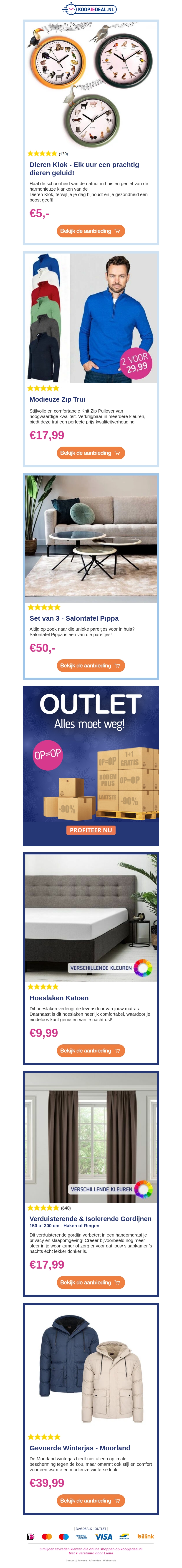 Bekijk onze aantrekkelijke leegverkoop met kortingen op diverse producten. Kies voor een schattige dieren klok voor slechts €5. Stijlvolle modieuze zip truien zijn nu verkrijgbaar voor €17,99. Vergeet niet de set van drie salontafels die perfect zijn voor elke woonkamer voor slechts €50.