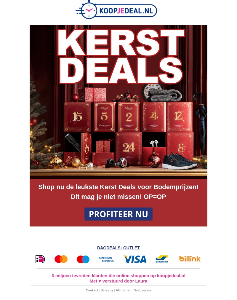 Ontdek de leukste Kerst deals bij Koopjedeal.nl. Geniet van spectaculaire kortingen op een breed scala aan producten, perfect om de feestdagen onvergetelijk te maken. OP=OP, dus wees er snel bij! Profiteer van onze special dagdeals en outlet aanbiedingen. Shop veilig met Visa of Mastercard. Ervaar de beste kerstinkopen online.