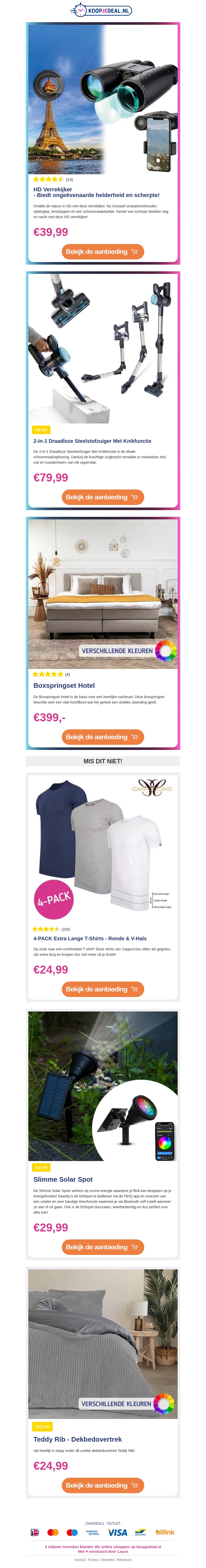 Mis deze MEGA SALE niet! Scoor nu een HD verrekijker voor €39,99, een 2-in-1 draadloze steelstofzuiger voor €79,99 en een luxe boxspringset hotel voor slechts €399,-. Daarnaast ook geweldige deals op kleding en huishoudelijke artikelen.