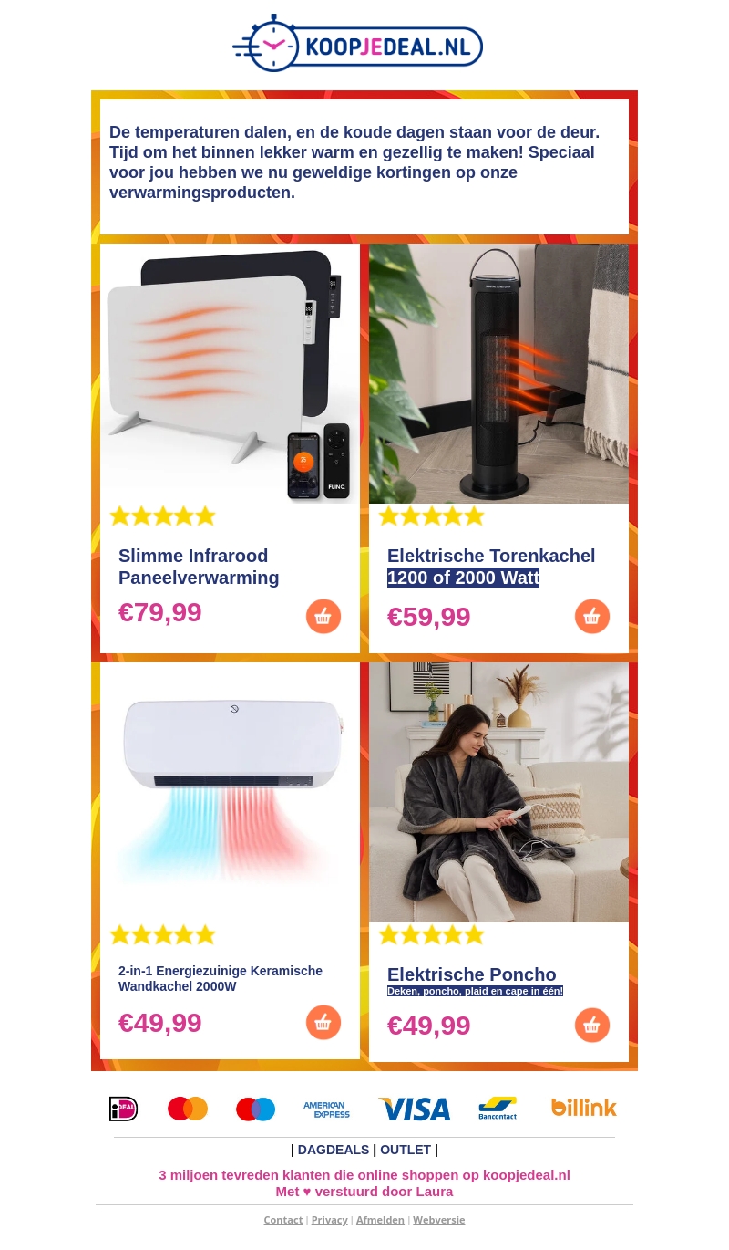 Met de dalende temperaturen is het tijd voor warmte in huis. Bij Koopjedeal.nl vind je nu geweldige kortingen op diverse verwarmingsproducten zoals infrarood panelen, elektrische heaters en verwarmingsdekens. Profiteer van deze deals om je huis warm en gezellig te maken. Ben je klaar voor een warme winter?