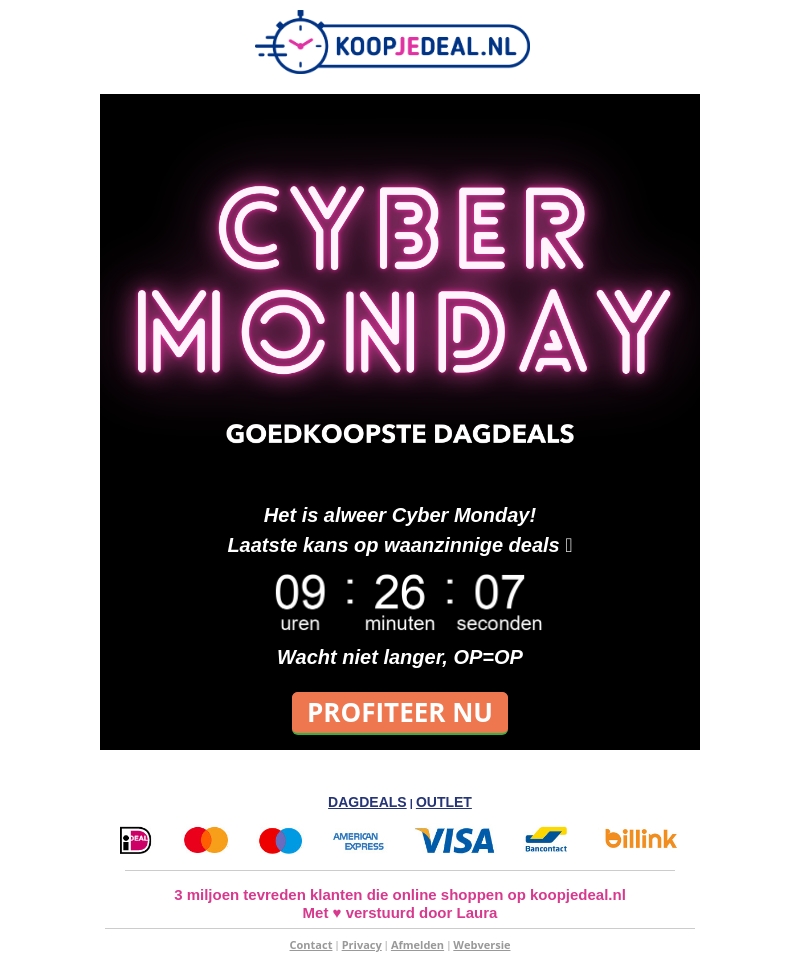 Het is weer tijd voor Cyber Monday bij Koopjedeal.nl! Geniet van de laagste prijs dagdeals op een breed scala aan producten. Sla je slag met de laatste kans op waanzinnige aanbiedingen. Wacht niet langer, want het aanbod is beperkt. Profiteer nu van deze unieke kans om grote besparingen te doen.