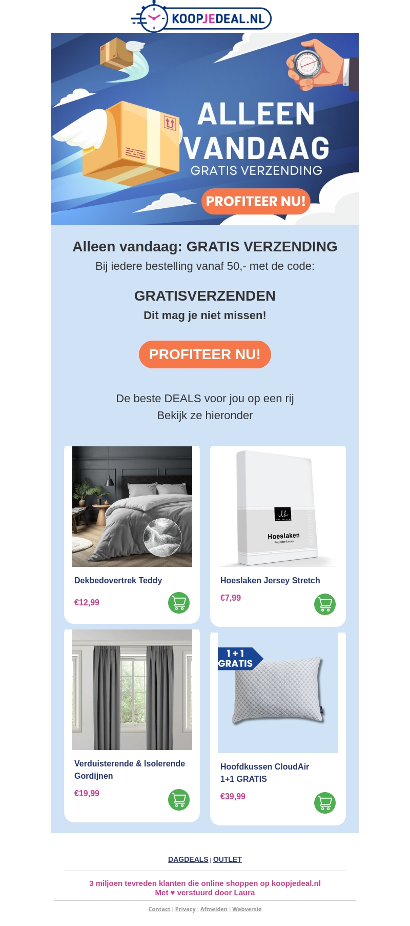 Alleen vandaag profiteer je van gratis verzending bij elke bestelling vanaf €50 op Koopjedeal.nl. Gebruik de code GRATISVERZENDEN en ontdek geweldige deals zoals Dekbedovertrek Teddy, Hoeslaken Jersey Stretch en meer. Haal voordeel uit 1+1 gratis aanbiedingen en bespaar nog meer. Mis deze kans niet!