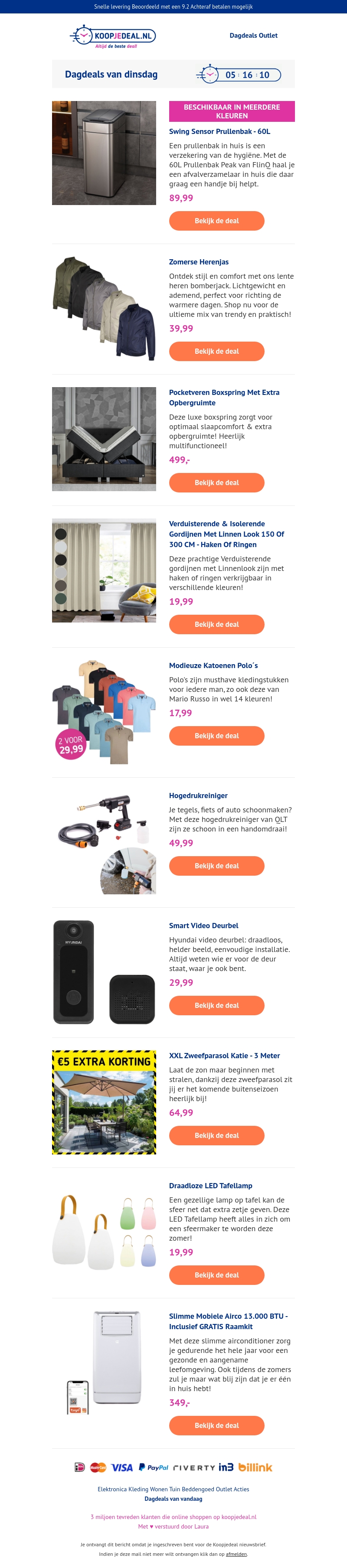 Profiteer van de beste dagdeals bij Koopjedeal.nl. Ontdek alles van sensor prullenbakken tot zomerse herenjassen, luxe boxsprings en nog veel meer. Laat geen enkele korting aan je voorbijgaan en bespaar vandaag nog!