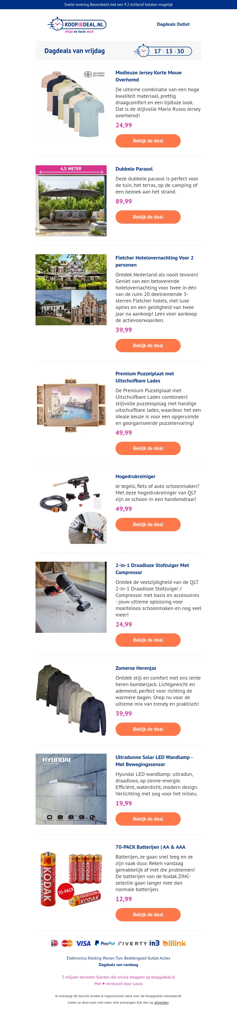 Mis deze kans niet om te profiteren van de beste deals van vrijdag op Koopjedeal.nl. Deze nieuwsbrief biedt een scala aan producten van modieuze herenkleding tot handige huishoudelijke apparaten. Ontdek de kwaliteit van de exclusieve Mario Russo Jersey overhemden, geniet van een nacht in een Fletcher hotel, of verbeter je tuinervaring met een dubbele parasol. Voor praktische toepassingen vind je ook een premium puzzelplaat, een krachtige hogedrukreiniger en een veelzijdige 2-in-1 stofzuiger. Bekijk nu alle aanbiedingen en bespaar vandaag nog!
