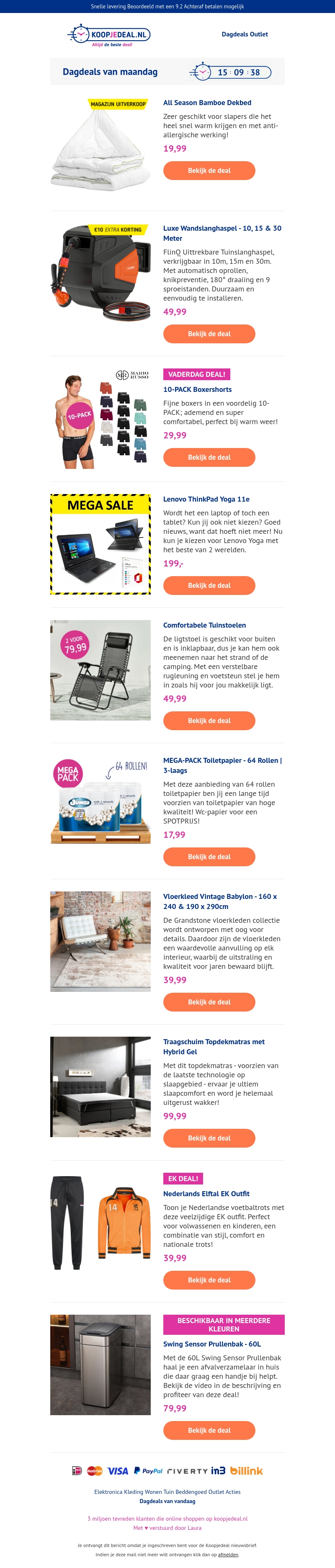Start de week goed met onze exclusieve dagdeals van maandag! Bespaar op een bamboe dekbed, tuinslang, Lenovo ThinkPad en meer. Ontdek de beste aanbiedingen met kortingen en profiteer van onze kwaliteitsproducten. Mis deze kans niet!