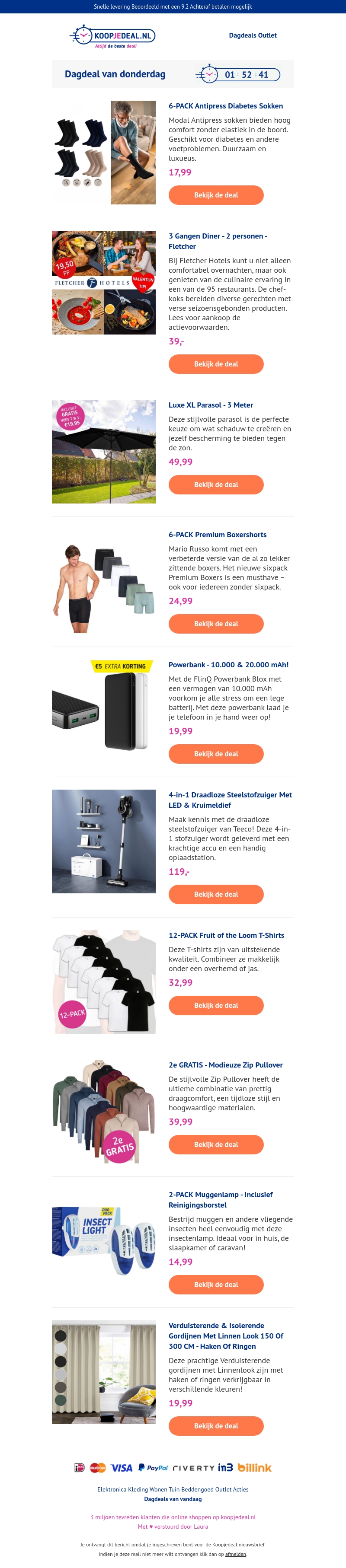 Bekijk onze nieuwste dagdeals met hoge kortingen op allerlei producten. Of je nu op zoek bent naar comfortabele sokken, een luxe parasol, premium boxershorts, een krachtige stofzuiger, of verduisterende gordijnen, we hebben het allemaal voor je. Mis het niet en shop nu bij Koopjedeal.nl!