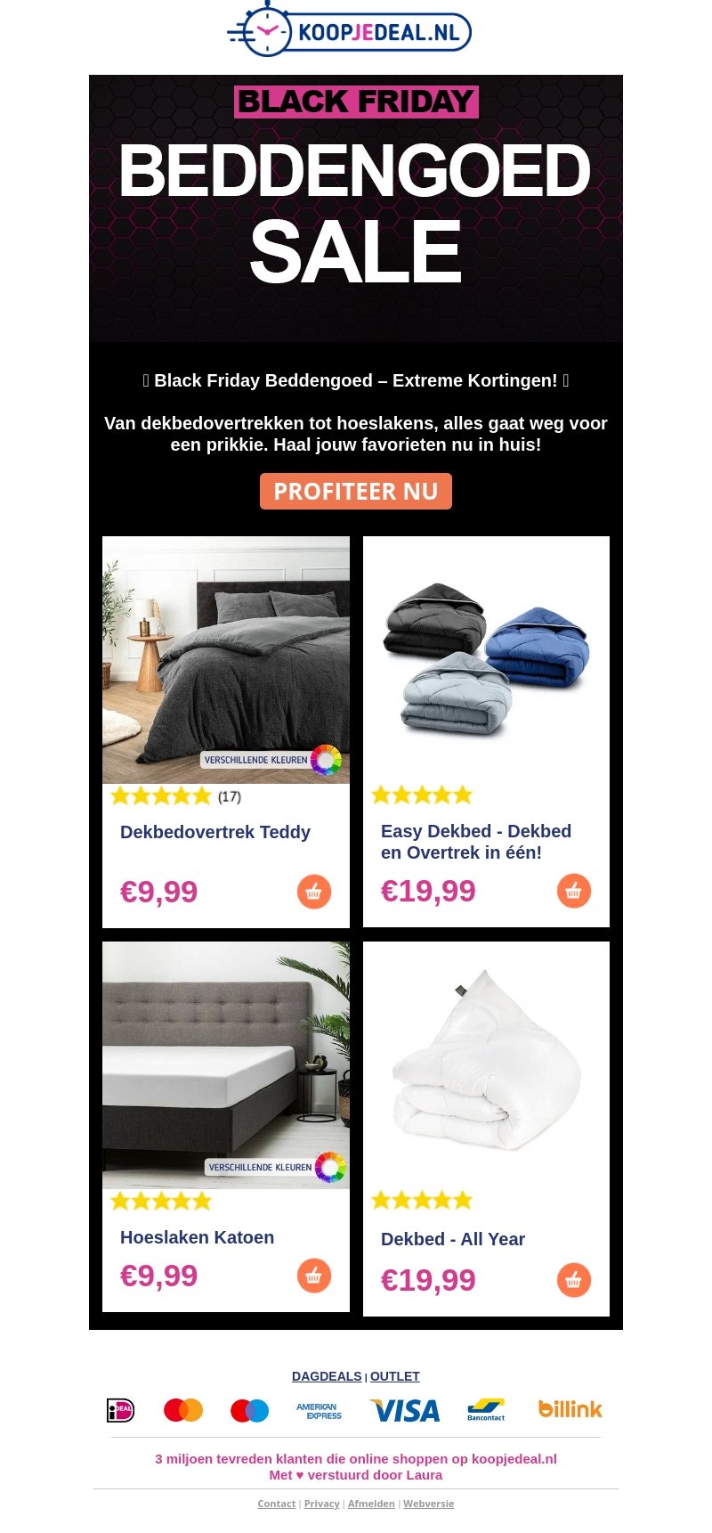 Deze Black Friday, biedt Koopjedeal.nl spannende kortingen op een breed scala aan beddengoed. Van dekbedovertrekken tot hoeslakens, er is voor ieder wat wils. Zorg ervoor dat je profiteert van deze beperkte aanbieding en je favoriete artikelen vandaag nog inslaat. Mis deze kans niet om je slaapkamer in stijl bij te werken tegen een fractie van de prijs.