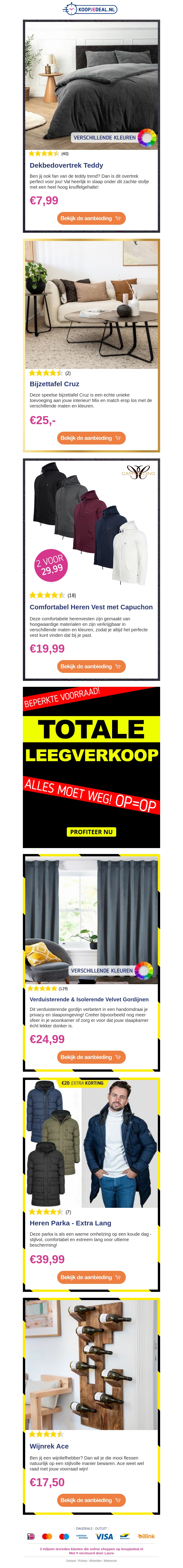 Mis de kans niet om een Teddy dekbedovertrek te scoren voor slechts €7,99. Bekijk ook de stijlvolle bijzettafel voor €25 en comfortabele herenkleding vanaf €19,99. Perfect voor een sfeervolle thuisomgeving en een trendy look. Koop snel jouw favoriete items voordat ze op zijn!