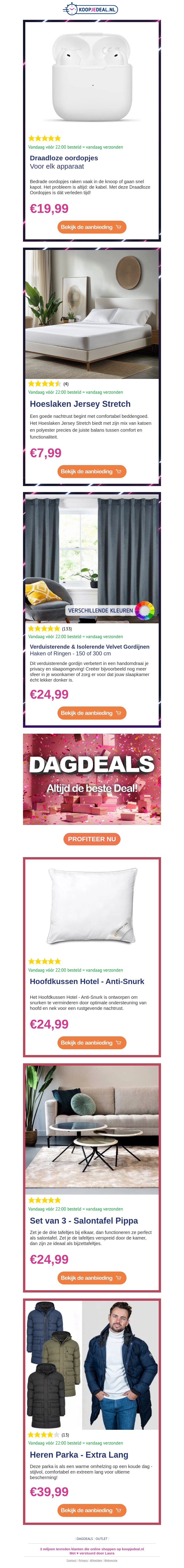 Grijp nu jouw draadloze oordopjes voor slechts β¬19,99! Verbeter je slaapkamer met isolerende velvet gordijnen. Ontdek meer geweldige deals zoals hoeslakens en salontafels in onze nieuwsbrief.