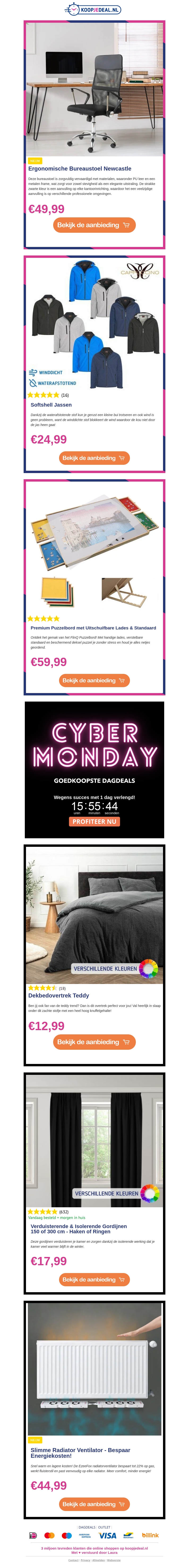 Profiteer van geweldige kortingen op ergonomische bureaustoelen voor slechts €49,99 en zachte softshell jassen voor €24,99. Ontdek ook het hoogwaardige puzzelbord voor €59,99. Mis de Cyber Monday deals niet, inclusief comfortabele dekbedovertrekken en energiebesparende radiatorventilatoren. Shop nu bij Koopjedeal.nl voor de beste aanbiedingen.
