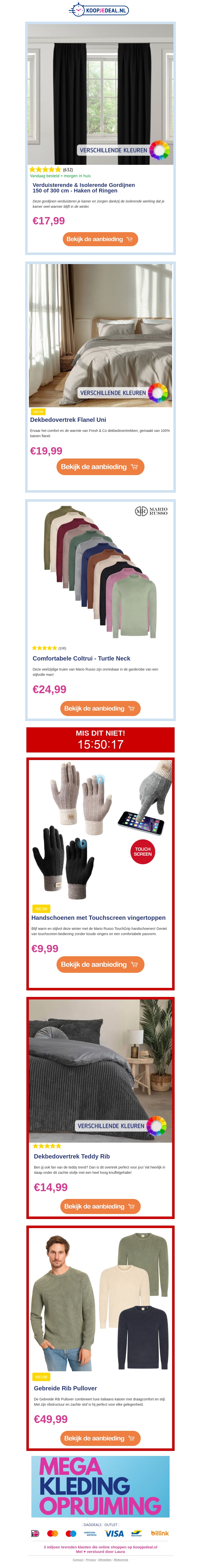 Deze nieuwsbrief brengt je scherpe aanbiedingen op verduisterende gordijnen voor β¬17,99, warme flanellen dekbedovertrekken vanaf β¬19,99 en stijlvolle coltruien voor slechts β¬24,99. Perfect voor het opfrissen van je interieur en je garderobe deze winter. Blader door onze selectie van hoogwaardige producten tegen scherpe prijzen. Sla je slag voor de aanbiedingen op zijn!