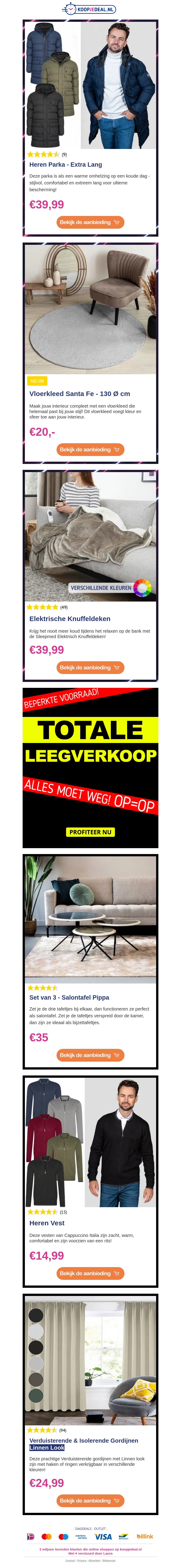 Ervaar de ultieme winterstijl met onze heren parka's voor slechts €39,99. Voeg een vleugje warmte toe aan je interieur met vloerkleden vanaf €20 en elektrische knuffeldekens voor €39,99. Pak daarnaast een deal op comfortabele heren vesten en gordijnen die privacy en isolatie bieden.