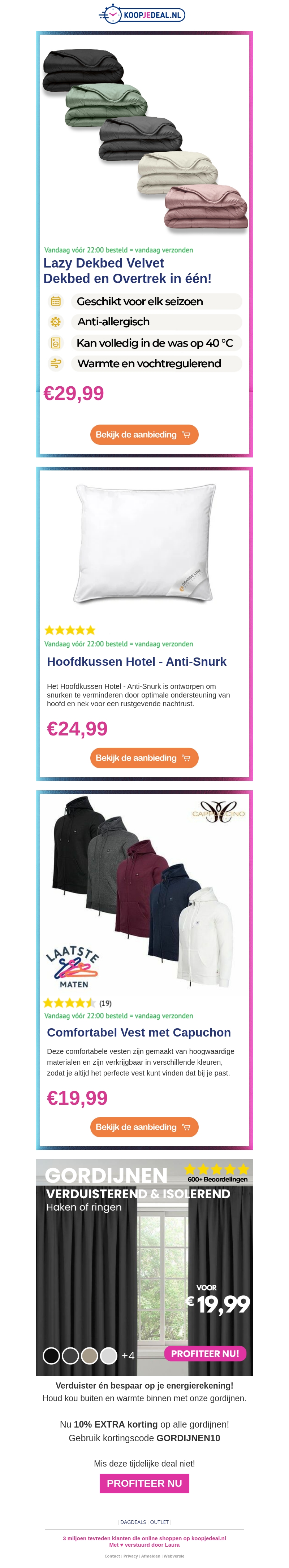 Mis deze geweldige deals niet! Geniet van comfort met ons Velvet Dekbed voor slechts β¬29,99, adem vrij met het Anti-Snurk Hoofdkussen voor β¬24,99, en blijf warm en stijlvol met ons Comfortabel Vest voor β¬19,99. Bestel voor 22:00 voor levering morgen.