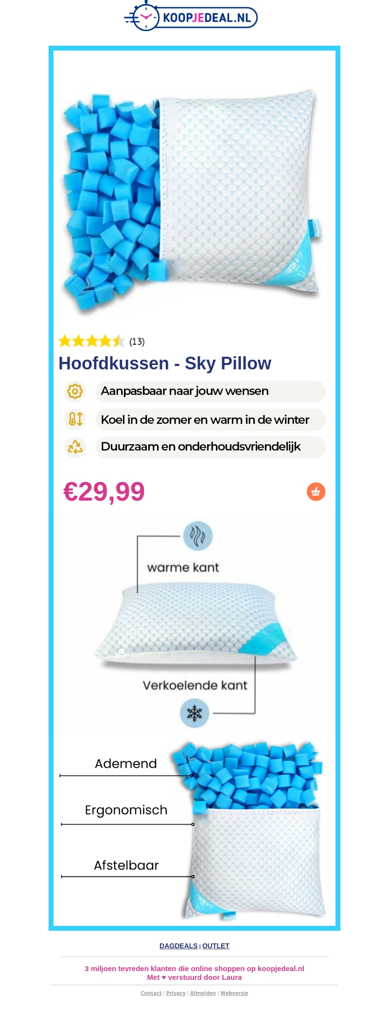 Het Sky Hoofdkussen biedt aanpasbaar comfort voor slechts €29,99. Geniet van ademend materiaal dat zowel verkoelend als verwarmend werkt, afhankelijk van het seizoen. Ergonomisch ontworpen en eenvoudig afstelbaar, biedt dit kussen duurzaamheid en gebruiksgemak.