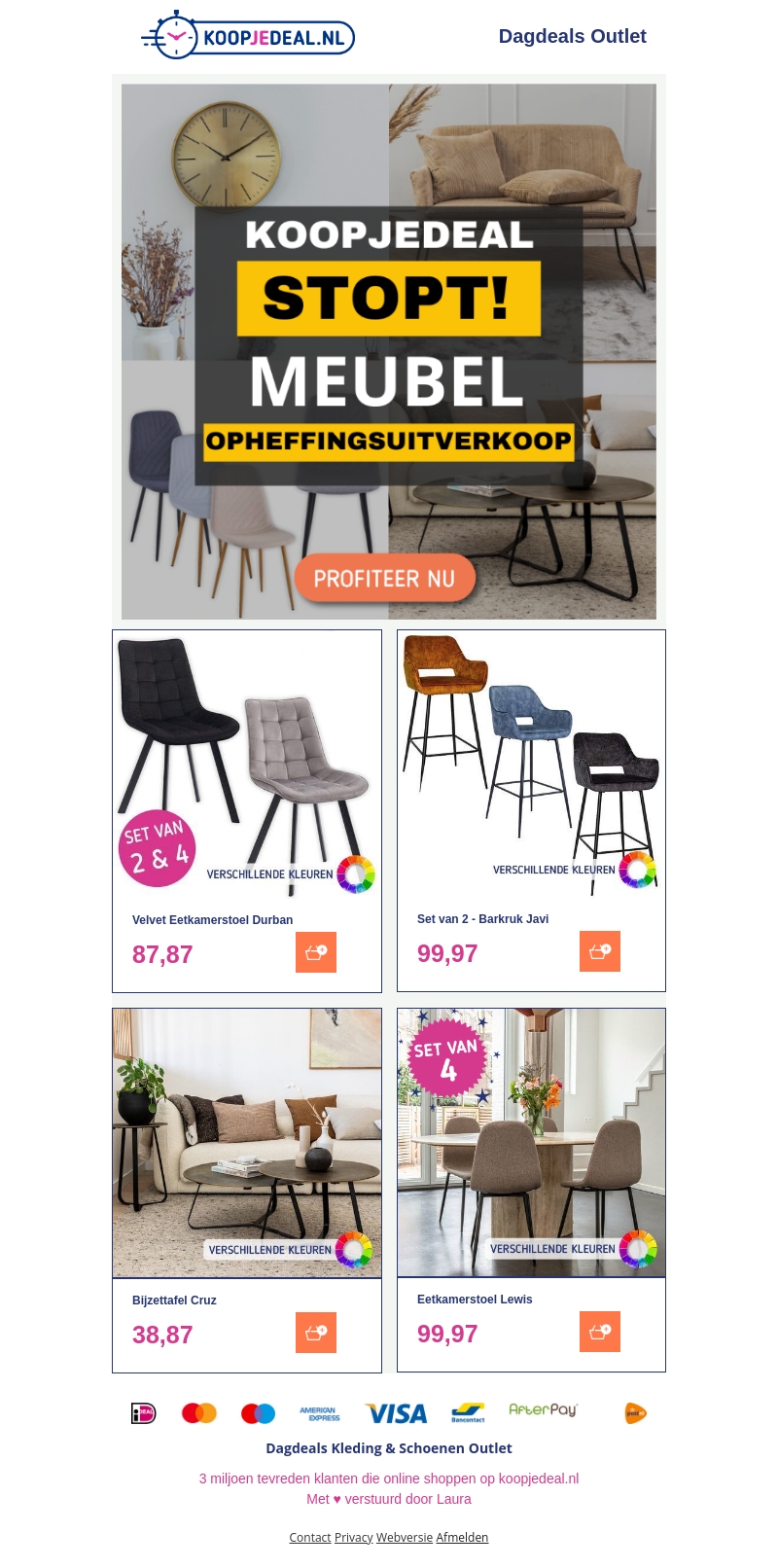 Koopjedeal stopt! Dit is je kans om te profiteren van geweldige kortingen op meubelsets. Van eetkamerstoelen tot bijzettafels, grijp je kans voordat het te laat is. Diverse kleuren voor ieder interieur. Profiteer nu!