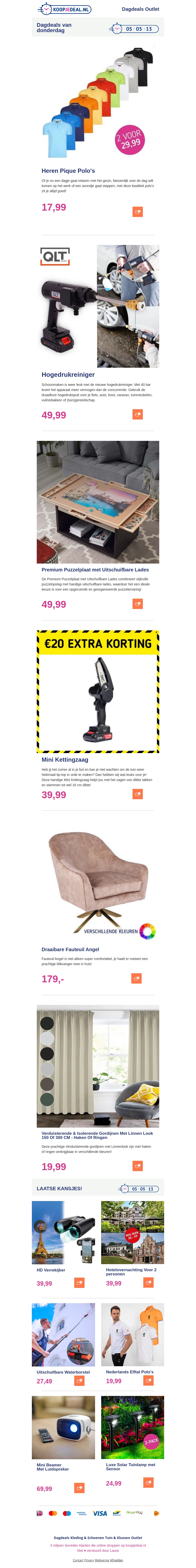 Mis de topdeals van vandaag niet! Ontdek scherpe prijzen op stijlvolle herenpolo's, handige hogedrukreinigers, premium puzzelplaten en veel meer. Bespaar extra met onze speciale kortingsactie. Haal snel jouw favorieten in huis!