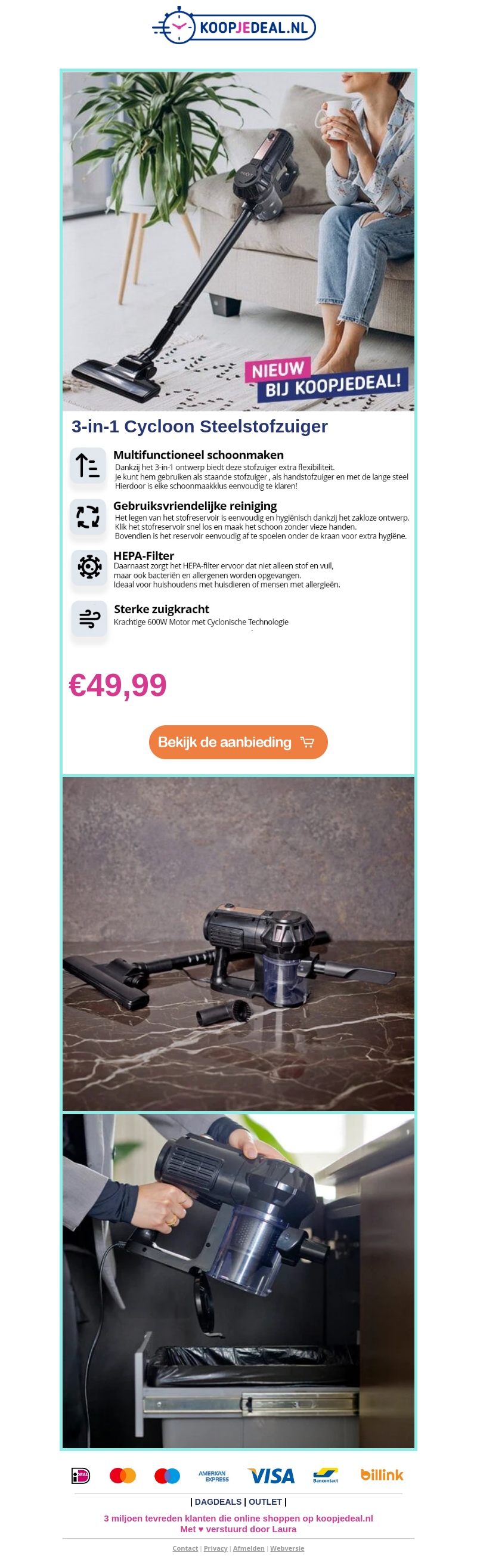 Ontdek de nieuwe 3-in-1 Cycloon Steelstofzuiger bij Koopjedeal.nl voor slechts €49,99. Deze stofzuiger biedt multifunctionele schoonmaakopties, gebruiksvriendelijke reiniging met een zakloos ontwerp en een krachtige 600W motor met cyclonische technologie. Dankzij het HEPA-filter vangt het ook bacteriën en allergenen op. Mis deze deal niet!