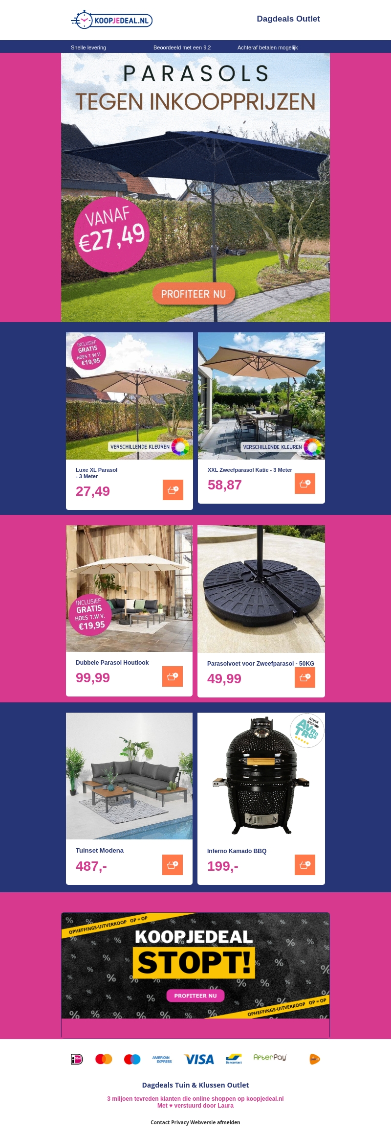 Ontdek nu geweldige aanbiedingen op parasols bij KoopjeDeal. Profiteer van inkoopprijzen vanaf slechts €27,49. Beschikbare opties zijn onder andere de Luxe XL Parasol, XXL Zweefparasol Katie, en meer. Dit is jouw kans om te genieten van kwaliteit tegen de beste prijzen. Mis het niet!