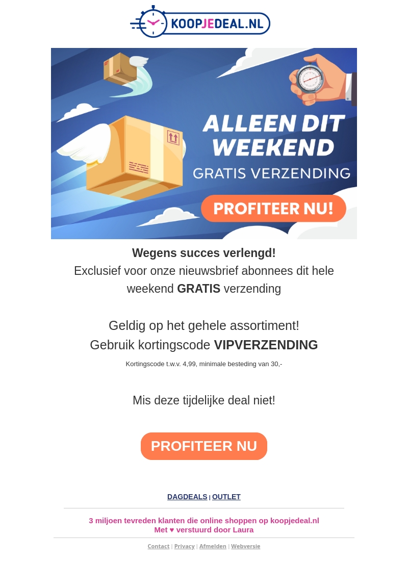 Dit weekend biedt Koopjedeal.nl exclusief gratis verzending voor abonnees van onze nieuwsbrief. Gebruik de kortingscode VIPVERZENDING en ontdek ons volledige assortiment. Mis deze kans niet om te besparen op uw favoriete producten. Geldig tot aanstaande zondag, met een minimale besteding van β¬30.