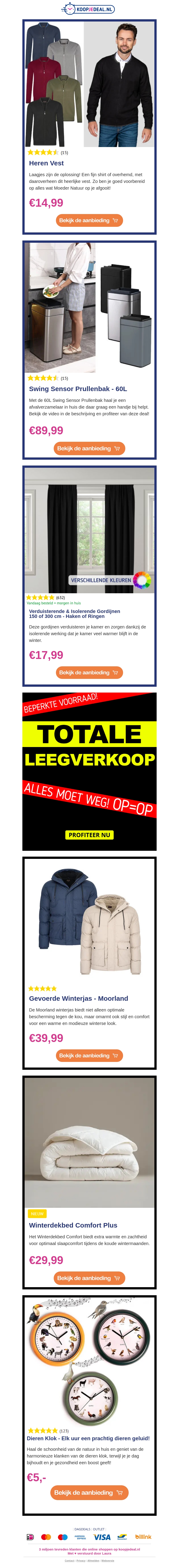 Bekijk de nieuwste aanbiedingen met verrassende kortingen. Van herenvesten en prullenbakken tot verduisterende gordijnen en luxe dekbedden, er is voor ieder wat wils. Mis ook de totale leegverkoop niet met scherpe prijzen!