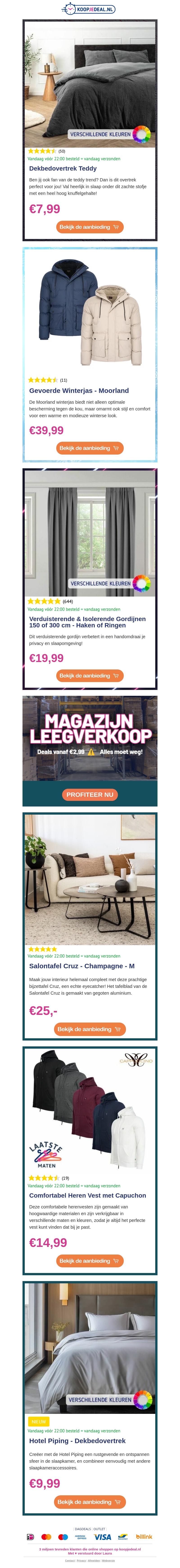 Ontdek geweldige kortingsacties op een breed scala aan producten zoals dekbedovertrekken, heren jassen, gordijnen, en nog veel meer. Profiteer van stijlvolle en comfortabele producten tegen verlaagde prijzen. Mis deze unieke kans niet om uw woning en garderobe te vernieuwen.