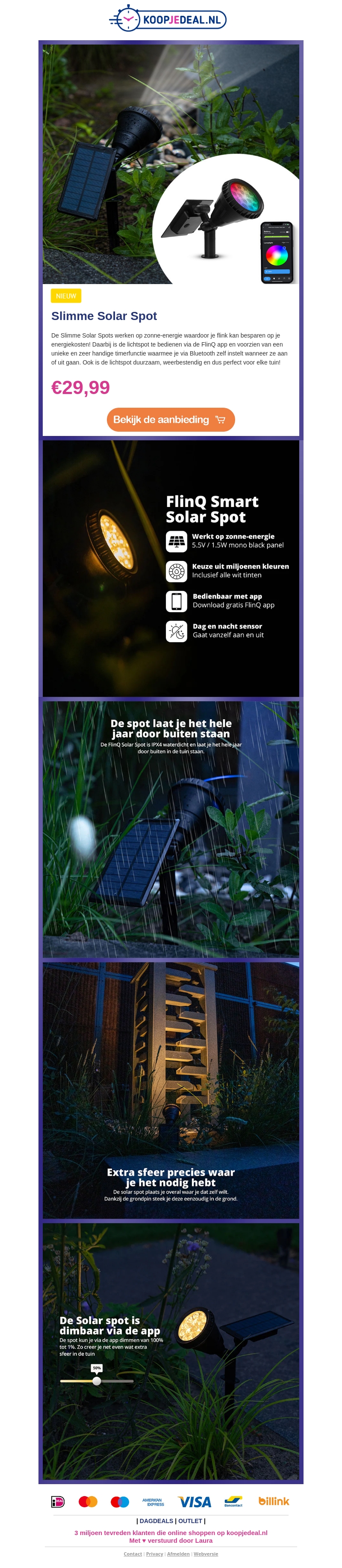 De Slimme Solar Spot werkt op zonne-energie en is eenvoudig te bedienen via de FlinQ app. Profiteer van miljoenen kleuren, een handige timerfunctie en dag/nacht sensor. Perfect voor elk tuinseizoen!