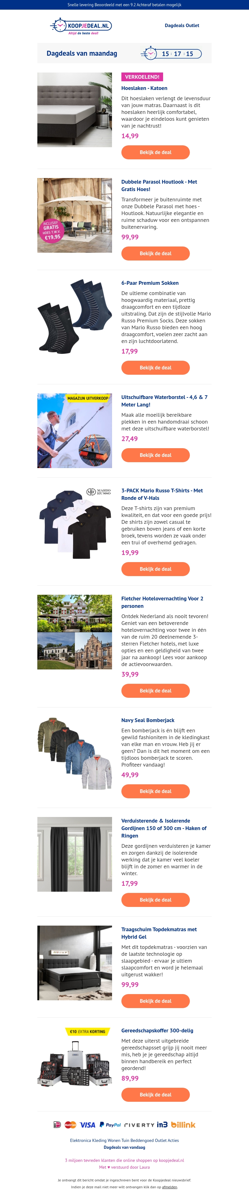 Start de week met fantastische deals op onze website! Vind topaanbiedingen zoals hoeslakens van katoen voor slechts €14.99, dubbele parasols met gratis hoes, en nog veel meer. Mis deze kans niet om geweldige producten te scoren tegen onverslaanbare prijzen.