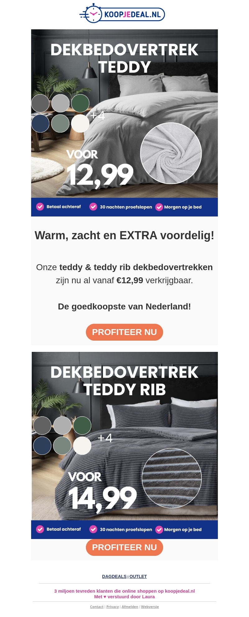 Warm, zacht en extra voordelig! Onze teddy en teddy rib dekbedovertrekken zijn nu al vanaf €12,99 verkrijgbaar. Geniet van 30 nachten proefslapen en betaal achteraf. Profiteer vandaag nog van de beste aanbiedingen in beddengoed.