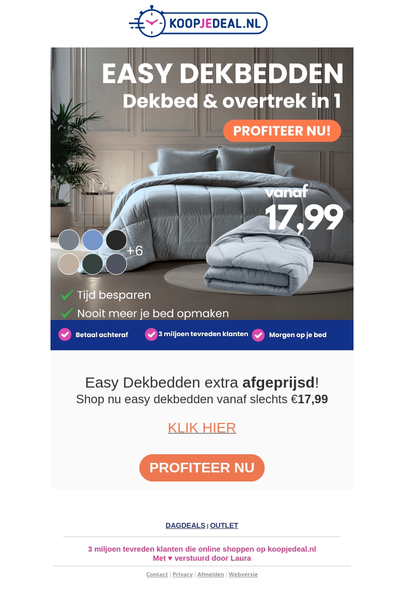 Easy Dekbedden van KOOPJEDEAL.nl bieden ultiem comfort door dekbed en overtrek in één te combineren. Bespaar tijd met minder bed opmaken en geniet van de lage prijs vanaf slechts €17,99. Ideaal voor wie gemak zoekt zonder in te boeten op stijl en kwaliteit.