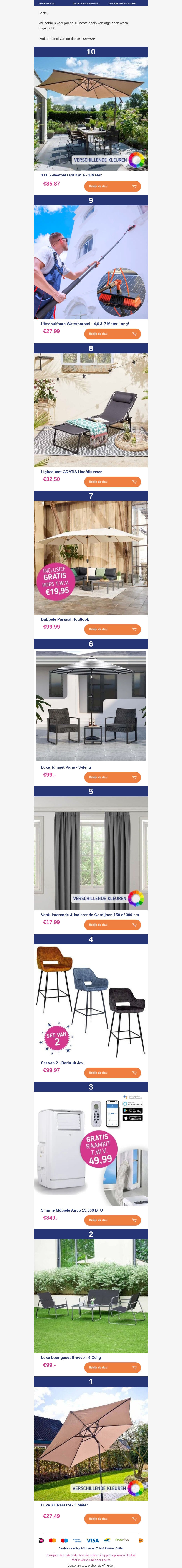 Bekijk de meest spectaculaire aanbiedingen van deze week, van parasols en luifel tot luxe loungesets en slimme mobiele airco's. Pak deze deals nu het nog kan!