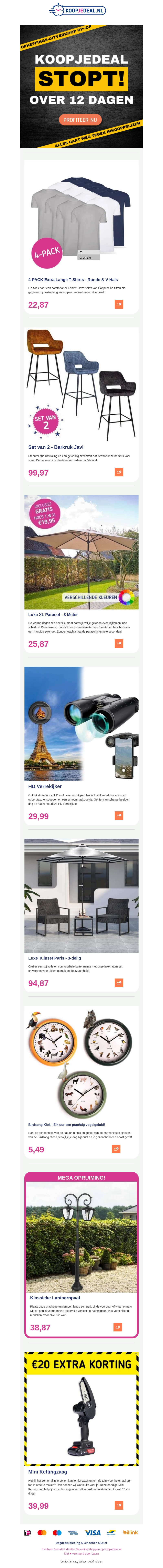 Mis deze kans niet! Koopjedeal stopt met een geweldige uitverkoop. Van comfortabele T-shirts tot elegante tuinsets, ontdek een breed scala aan producten tegen inkoopprijzen. Profiteer nu van extra kortingen en unieke deals. Wees snel, deze aanbiedingen zijn beperkt!