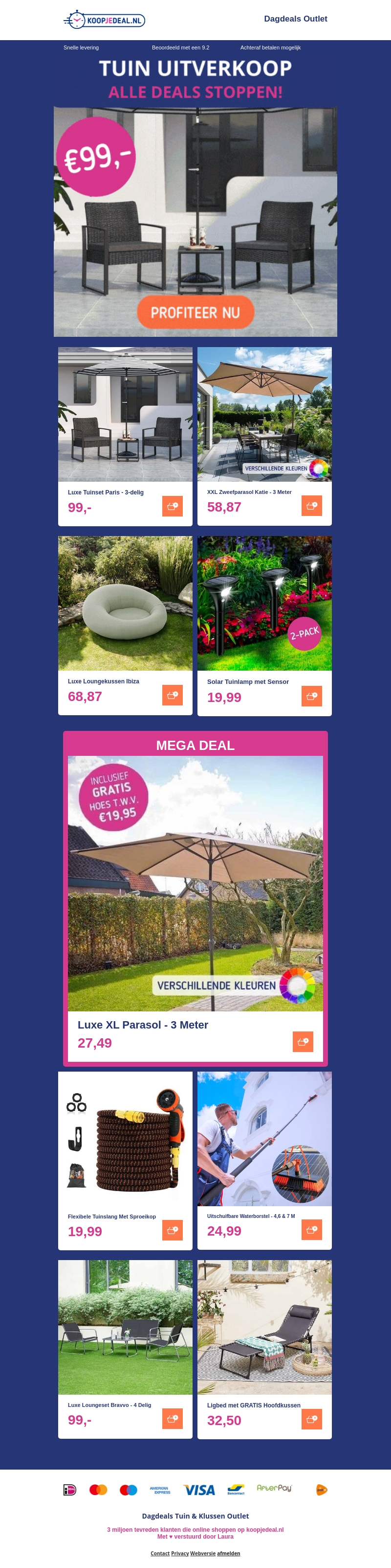 De Tuin Uitverkoop is nu aan! Geniet van uitzonderlijke kortingen op een breed scala aan tuinartikelen, van luxe tuinsets en parasols tot solar tuinlampen en meer. Wacht niet te lang, want deze deals duren maar kort en op=op!