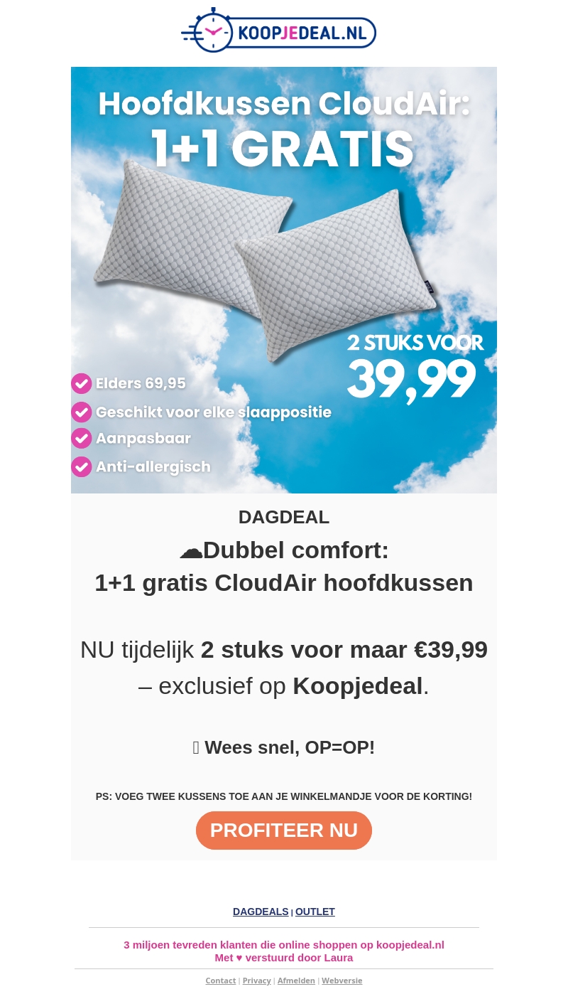 Verhoog je slaapcomfort met de CloudAir hoofdkussens! Maak gebruik van de tijdelijke 1+1 gratis actie bij Koopjedeal. Inclusief aanpasbare, anti-allergische kussens geschikt voor elke slaappositie. Haast je, want OP=OP!