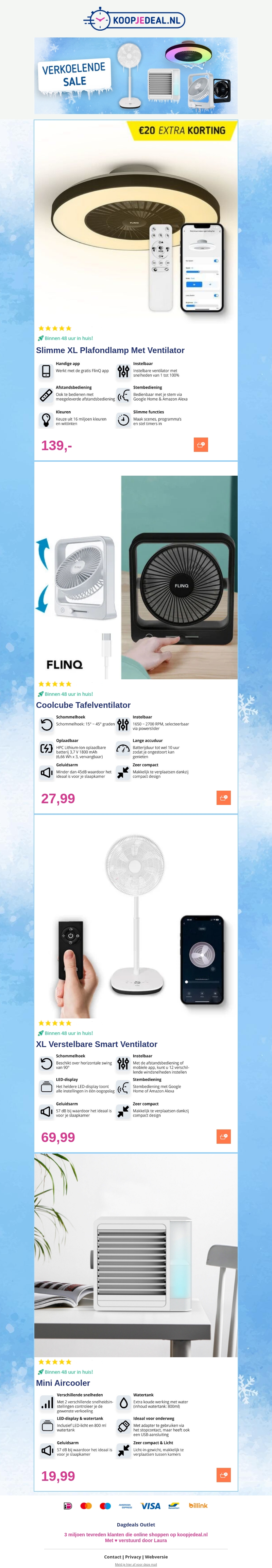 Ontdek de beste ventilatoren en aircoolers tijdens onze Verkoelende Sale! Bespaar tot €20 op slimme plafondlamp ventilatoren, tafelventilatoren, verstelbare smart ventilatoren en compacte aircoolers. Perfect voor hete zomerdagen. Haal nu jouw koeloplossing in huis.