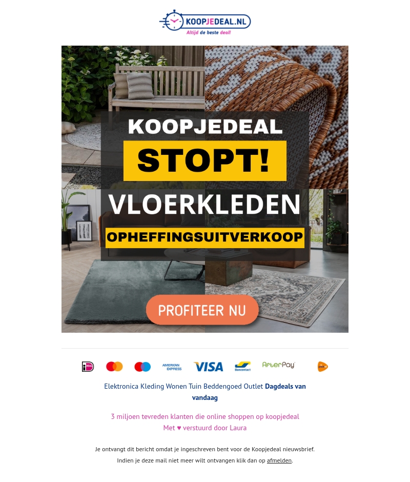 Koopjedeal stopt en organiseert een enorme opheffingsuitverkoop van vloerkleden! Profiteer nu van geweldige kortingen op diverse vloerkleden. Wees er snel bij, want op is echt op. Bezoek nu onze website en grijp je kans om hoogwaardige vloerkleden tegen een lage prijs te scoren!