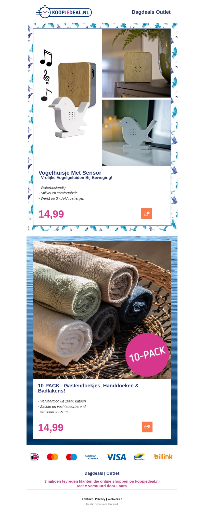 Bij KoopjeDeal.nl hebben we weer geweldige aanbiedingen! Scoor nu een waterbestendig vogelhuisje met sensor voor vrolijke vogelgeluiden bij beweging. Daarnaast hebben we een 10-pack van zachte, katoenen handdoeken in diverse kleuren. Mis deze deals niet!
