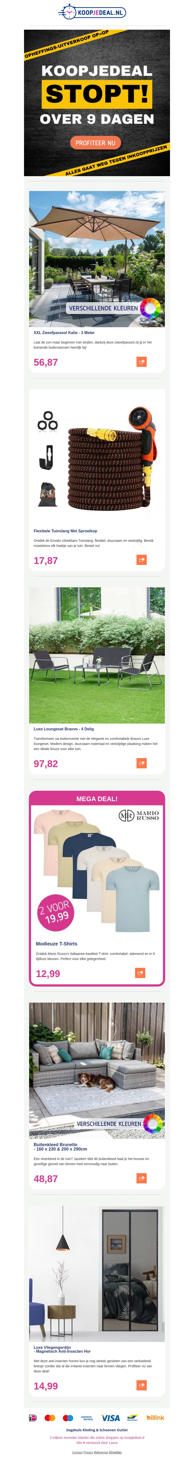 Mis deze geweldige aanbiedingen niet! Verkrijg een XXL Zweefparasol voor slechts €56,87. Koop modieuze T-Shirts 2 voor €19,99 en geniet van een flexibele tuinslang met extra korting. Bezoek Koopjedeal nu en ontdek meer geweldige deals!