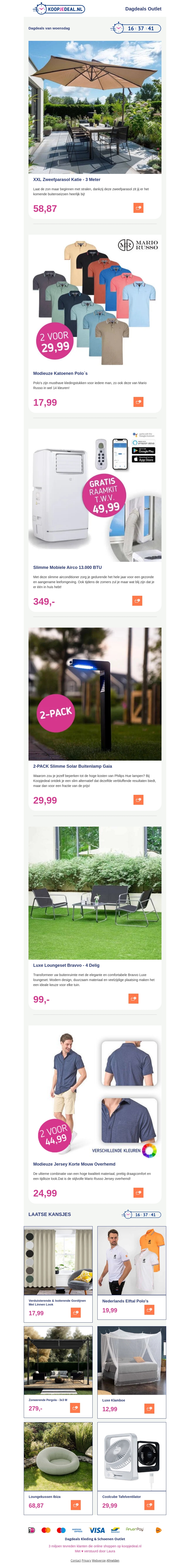 Profiteer van fantastische aanbiedingen zoals de XXL Zweefparasol voor slechts €58,87. Koop twee modieuze katoenen polo's voor €29,99 of een slimme mobiele airco inclusief gratis raamkit voor €349,-. Bekijk ook overige spectaculaire aanbiedingen!