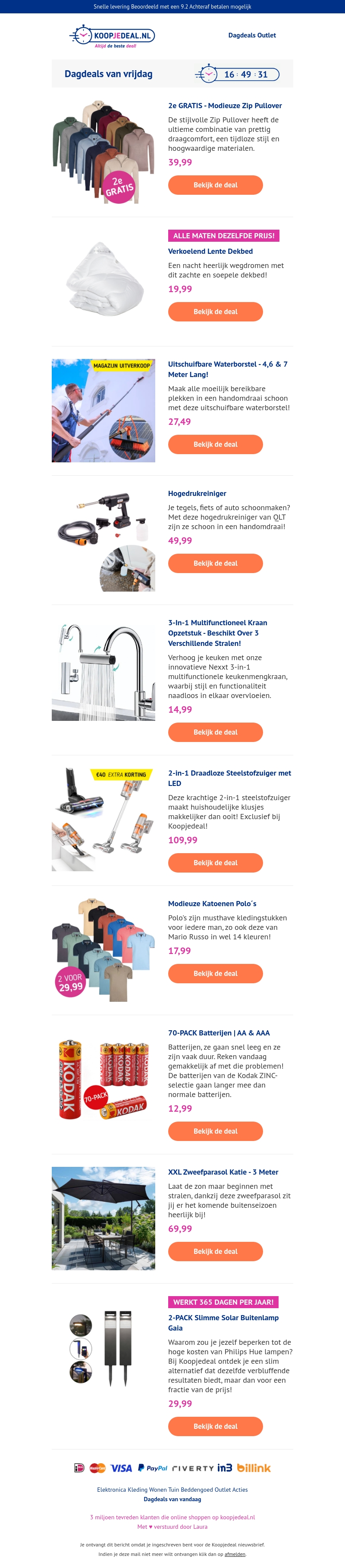Koopjeddeal.nl biedt vandaag geweldige aanbiedingen zoals een 2e gratis Zip Pullover en een verkoelend lente dekbed voor dezelfde prijs in alle maten. Ook beschikbaar zijn een uitschuifbare waterborstel, een hogedrukreiniger, een 3-in-1 multifunctionele kraan opzetstuk, en nog veel meer.