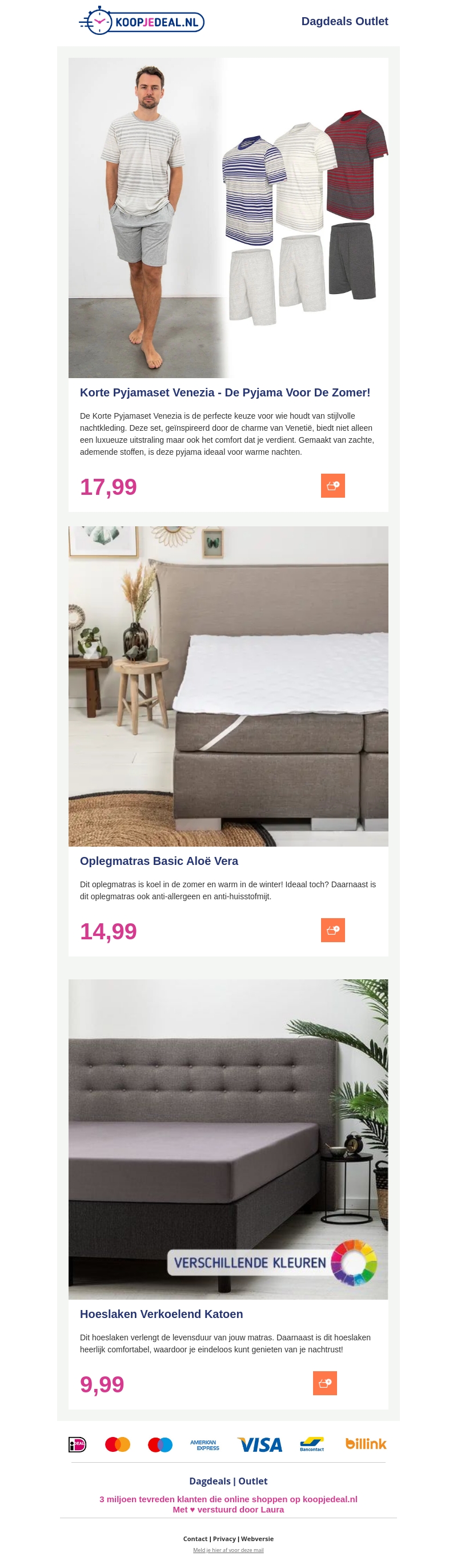 De Korte Pyjamaset Venezia is perfect voor wie houdt van stijlvolle nachtkleding en biedt luxe comfort. Nu beschikbaar voor €17,99. Ontdek ook het Oplegmatras Basic Aloë Vera voor €14,99; koel in de zomer en warm in de winter. Verleng de levensduur van je matras met het Hoeslaken Verkoelend Katoen, verkrijgbaar vanaf €9,99.