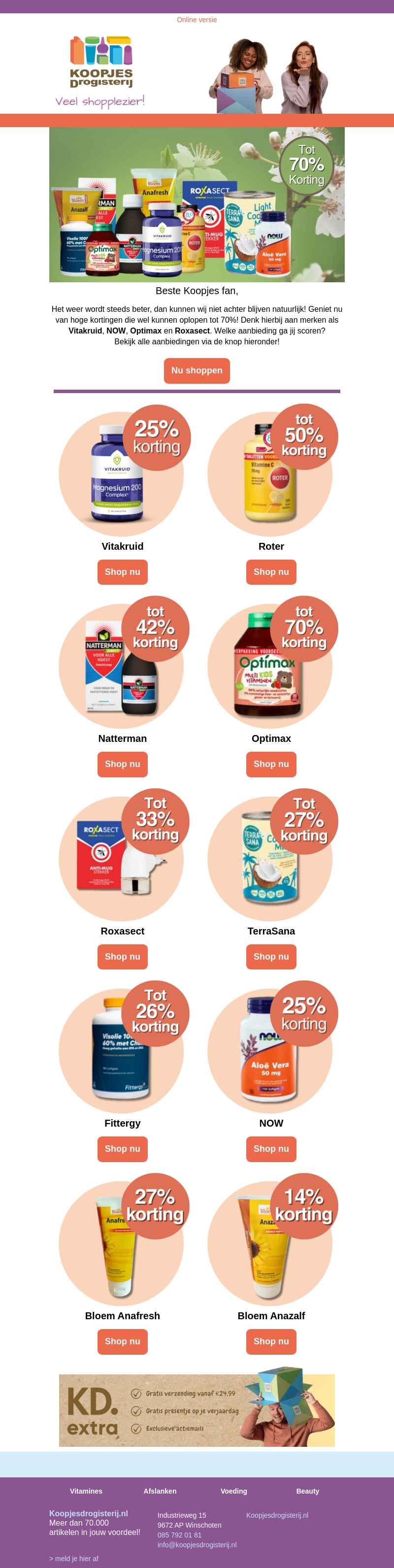 Koopjesdrogisterij biedt je geweldige kortingen tot 70% op topmerken zoals Vitakruid, Roter, Natterman, en meer. Perfect voor je lentereizen of om je gezondheid een boost te geven. Ontdek aanbiedingen en start met besparen.