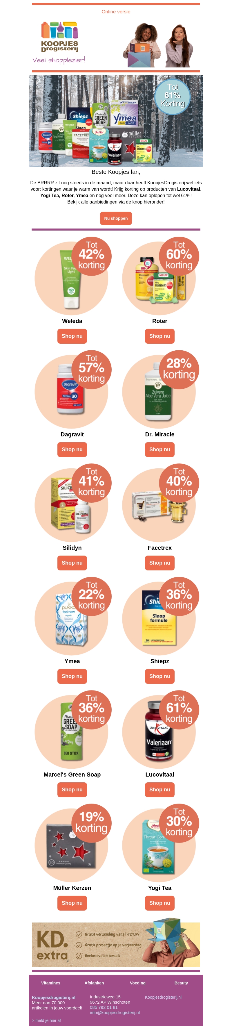 De BRRRR zit nog steeds in de maand, maar dat betekent geweldige aanbiedingen bij KoopjesDrogisterij. Ontdek kortingen tot 61% op populaire merken zoals Lucovitaal, Yogi Tea en Weleda. Blijf warm met onze exclusieve deals en bestel eenvoudig online. Mis het niet!