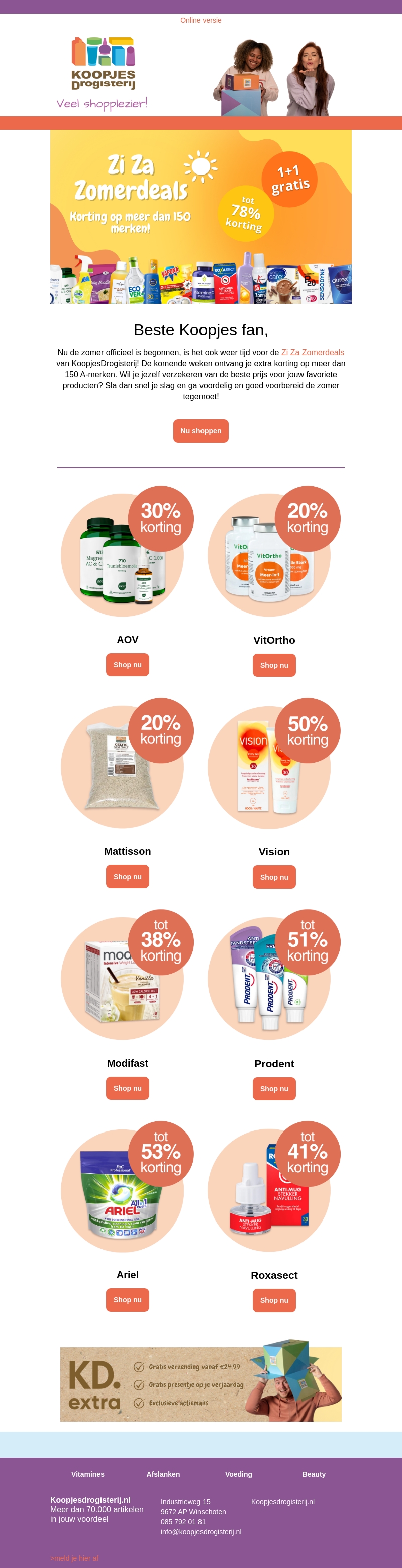 De zomer is officieel begonnen en dat betekent dat de Zi Za Zomerdeals van KoopjesDrogisterij hier zijn! Geniet van kortingen tot wel 78% op meer dan 150 merken. Of je nu op zoek bent naar vitamines, verzorgingsproducten of huishoudelijke artikelen, je vindt het allemaal tijdens deze geweldige actieperiode. Haast je, want op=op!