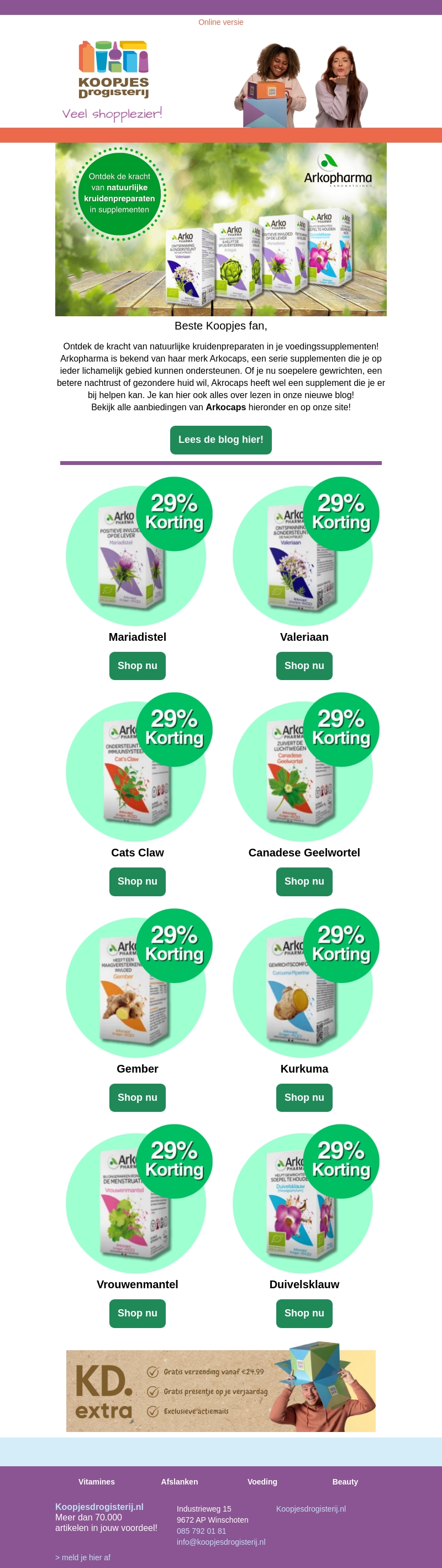 Arkopharma's Arkocaps-serie biedt een scala aan natuurlijke voedingssupplementen die uw gezondheid ondersteunen. Profiteer nu van 29% korting op populaire producten zoals Mariadistel, Valeriaan en Kurkuma. Lees onze blog voor meer informatie over hoe Arkocaps uw welzijn kan verbeteren. Mis deze kans niet om uw gezondheid met natuurlijke middelen te bevorderen!